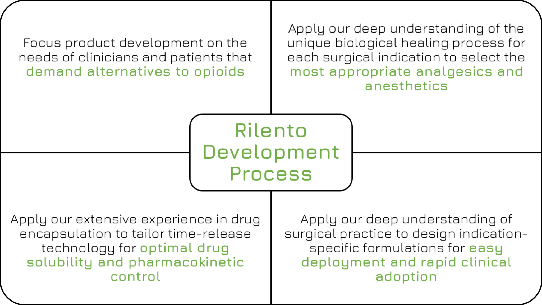 Rilento has developed a unique and efficient approach for rapid concept prototyping and testing to maximize fit-for-purpose formulations with broad clinician appeal: